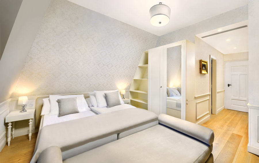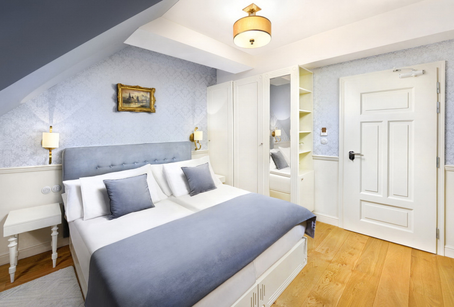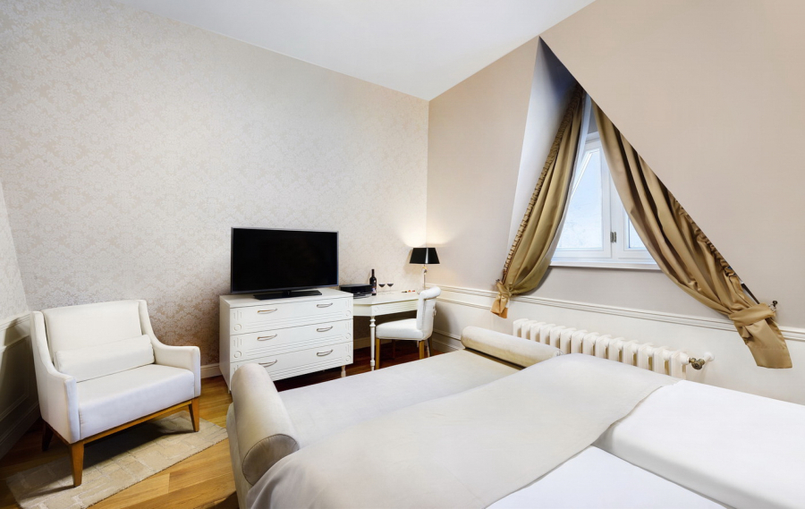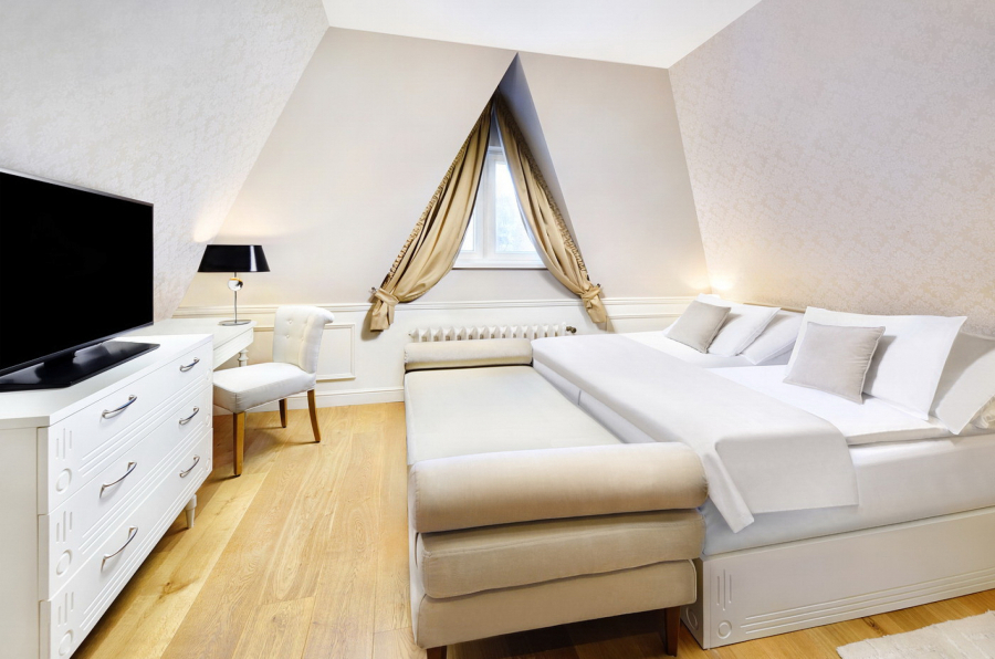 Historická podkrovná izba s rozlohou 19 m2 sa nachádza v pôvodnej, historickej časti hotela na 3. poschodí. Priestoru dominuje vkusná kombinácia historických prvkov v kontraste s modernými líniami a farbami. Oddychujte v historickej časti hotela a nechajte sa vtiahnuť do jeho príbehu v podkrovnej izbe s prvotriednym vybavením. V izbe je možné ubytovanie so psom za príplatok.
