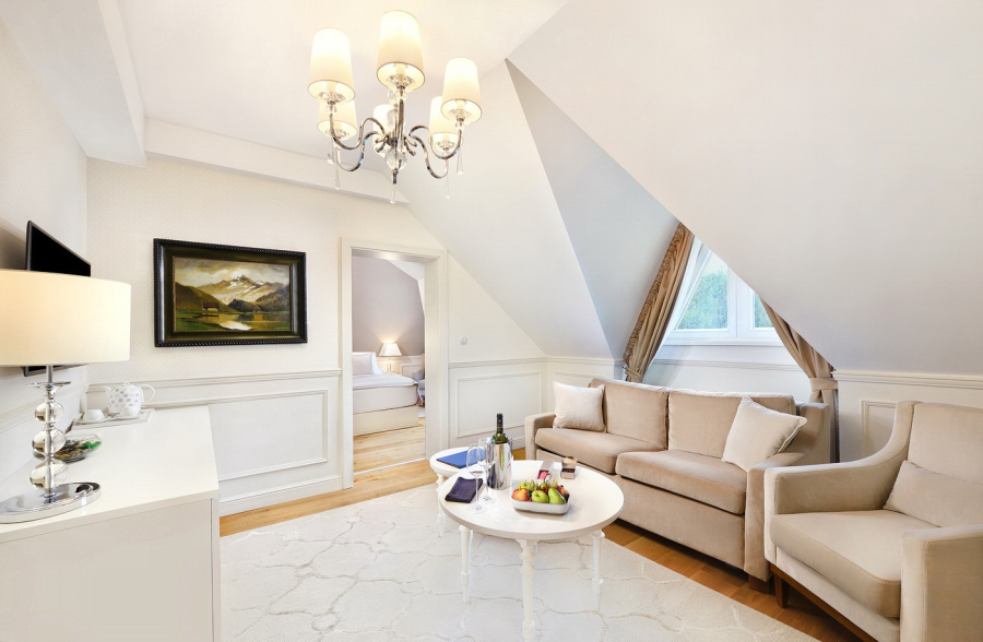 Štýlový apartmán s rozlohou 34 m² v podkroví historickej časti hotela disponuje obývacou izbou so sedacou súpravou a LCD TV a spálne. Je ideálny pre rodiny s deťmi, a to aj vďaka možnosti dvoch prísteliek. Dizajn v zemitých tónoch kombinuje historické prvky s moderným vybavením. Skosené stropy prinášajú do priestoru útulnú atmosféru s výhľadom na Lomnický štít a mestský park. V apartmáne je možné ubytovanie so psom za príplatok.
